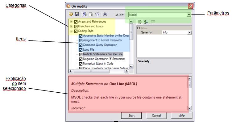 Cada item da auditoria tem uma nota explicativa representando o modo correto e o incorreto para utilização da mesma, tornando mais fácil o entendimento por parte do desenvolvedor naquele item da auditoria. Cada um desses itens pode ter seu nível de severidade alterado entre: Info, Warning e Error. Ficando a critério do desenvolvedor definir a importância do item.