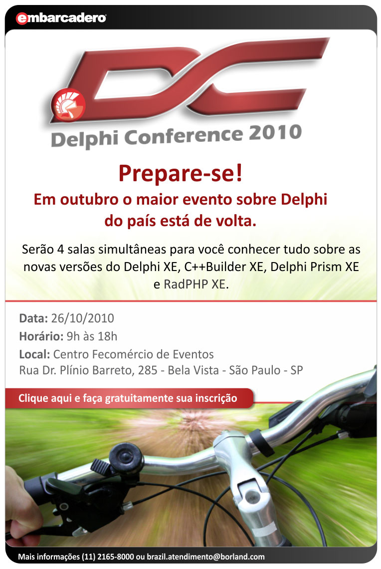 ATENÇÃO COMUNIDADE DELPHI, o Delphi Conference 2010 tem apenas 100 vagas disponíveis, recomendamos que você faça sua inscrição ainda esta semana para garantir sua vaga.